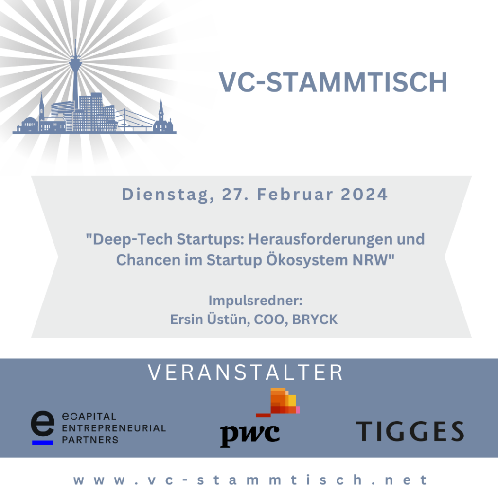 Zu unserem VC-Stammtisch Düsseldorf am Dienstag, den 27.02.2024 um 12:30 Uhr laden wir Sie ganz herzlich ein! Wir freuen uns sehr darauf, Herrn Ersin Üstün (COO, BRYCK) als Impulsredner zum Thema „Deep-Tech Startups: Herausforderungen und Chancen im Startup Ökosystem NRW" begrüßen zu dürfen!