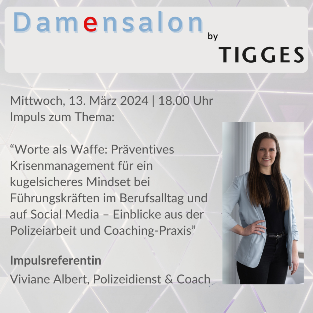 Veranstaltung Damensalon | Mi, 13.03.24 | Keynote: Worte als Waffe: Präventives Krisenmanagement für ein kugelsicheres Mindset bei Führungskräften im Berufsalltag und auf Social Media