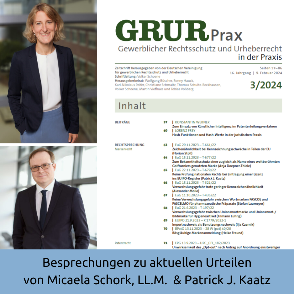 In der aktuellen Ausgabe der Zeitschrift GRUR-Prax (Heft 3/2024) haben zwei Anwälte unseres IP-Teams Besprechungen zu aktuellen Urteilen aus den Bereichen Persönlichkeits- und Medienrecht sowie Markenrecht veröffentlicht. Die GRUR-Prax bietet zweimal im Monat einen praxisorientierten Überblick über wichtige Entscheidungen und Neuerungen im Gewerblichen Rechtsschutz sowie im Urheber- und Medienrecht.