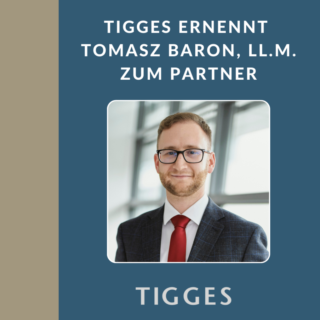 Die Wirtschaftskanzlei TIGGES freut sich bekannt zu geben, dass Tomasz Baron, LL.M., mit Wirkung zum 1. Januar 2025 als Partner in den Kreis der Gesellschafter aufgenommen wurde.